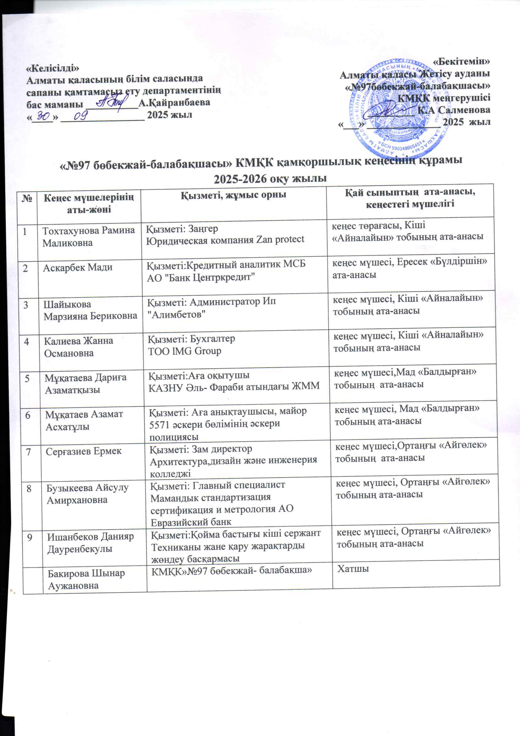 "Қамқоршылық кеңес құрамы" » МКҚК " №97 бөбекжай-балабақша"